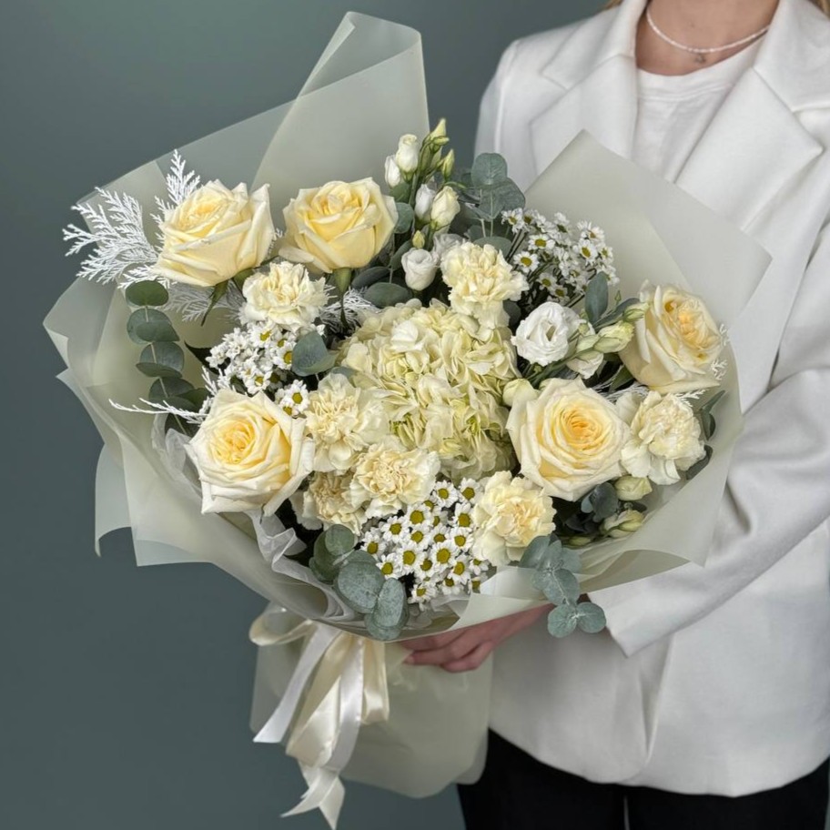 Очаровательный букет в светлых оттенках. Будет бережно доставлен в аквапаке и транспортировочной коробке.