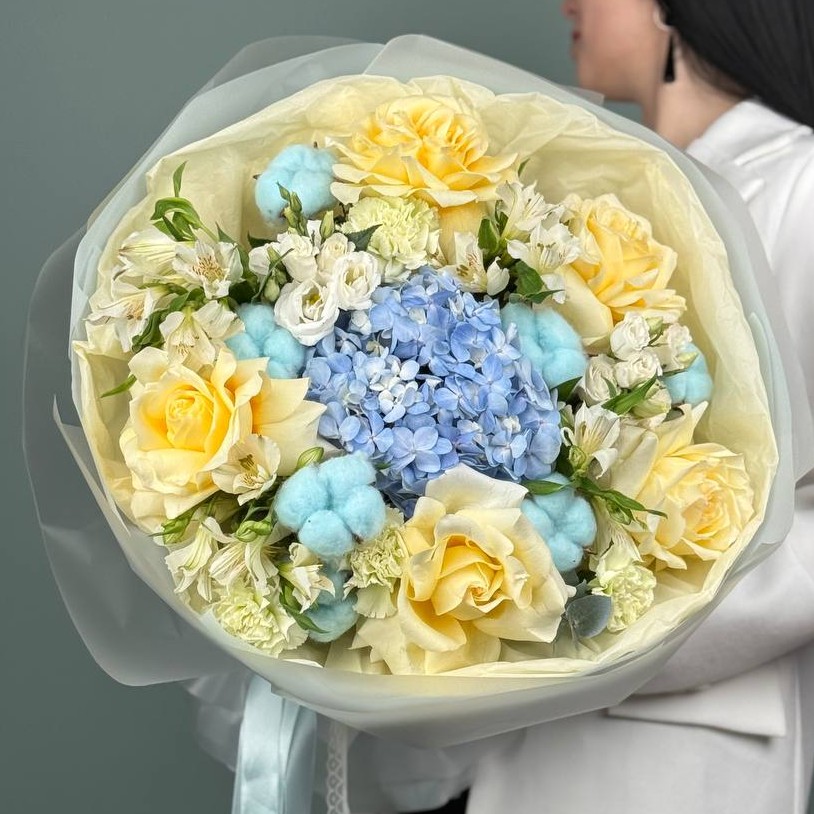 Прекрасный букет в небесных оттенках. Будет бережно доставлен в аквапаке и транспортировочной коробке.