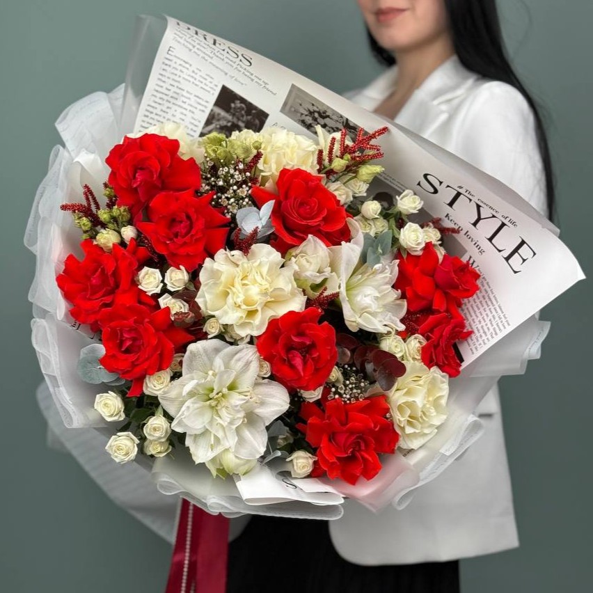 Красивый букет в классических красных и белых оттенках. Будет бережно доставлен в аквапаке и транспортировочной коробке.