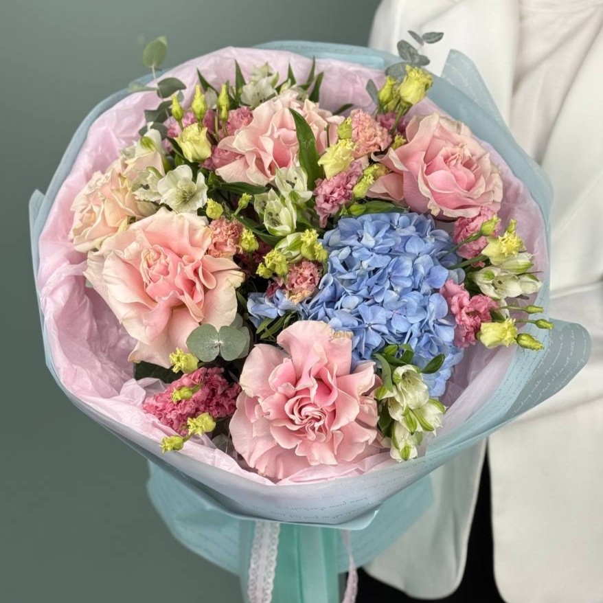 Альстромерия-5, Гортензия-1, Роза 80см-5, Эустома-5, Эвкалипт банч-0,2, Коробка-Переноска-1, Лента-1, Пленка-1