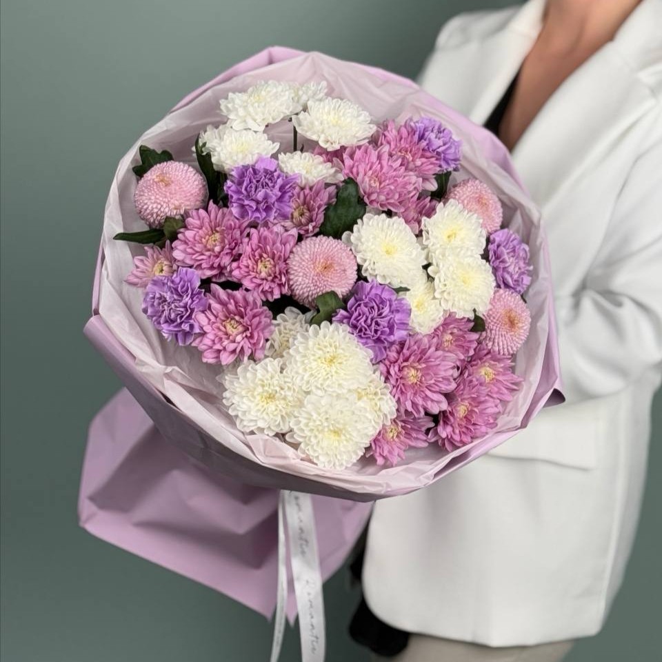 Очень стойкий и нежный букет из сортовых хризантем и гвоздик. Цветы в букете не окрашены, это их естественные оттенки. Будет бережно доставлен в аквапаке и транспортировочной коробке.