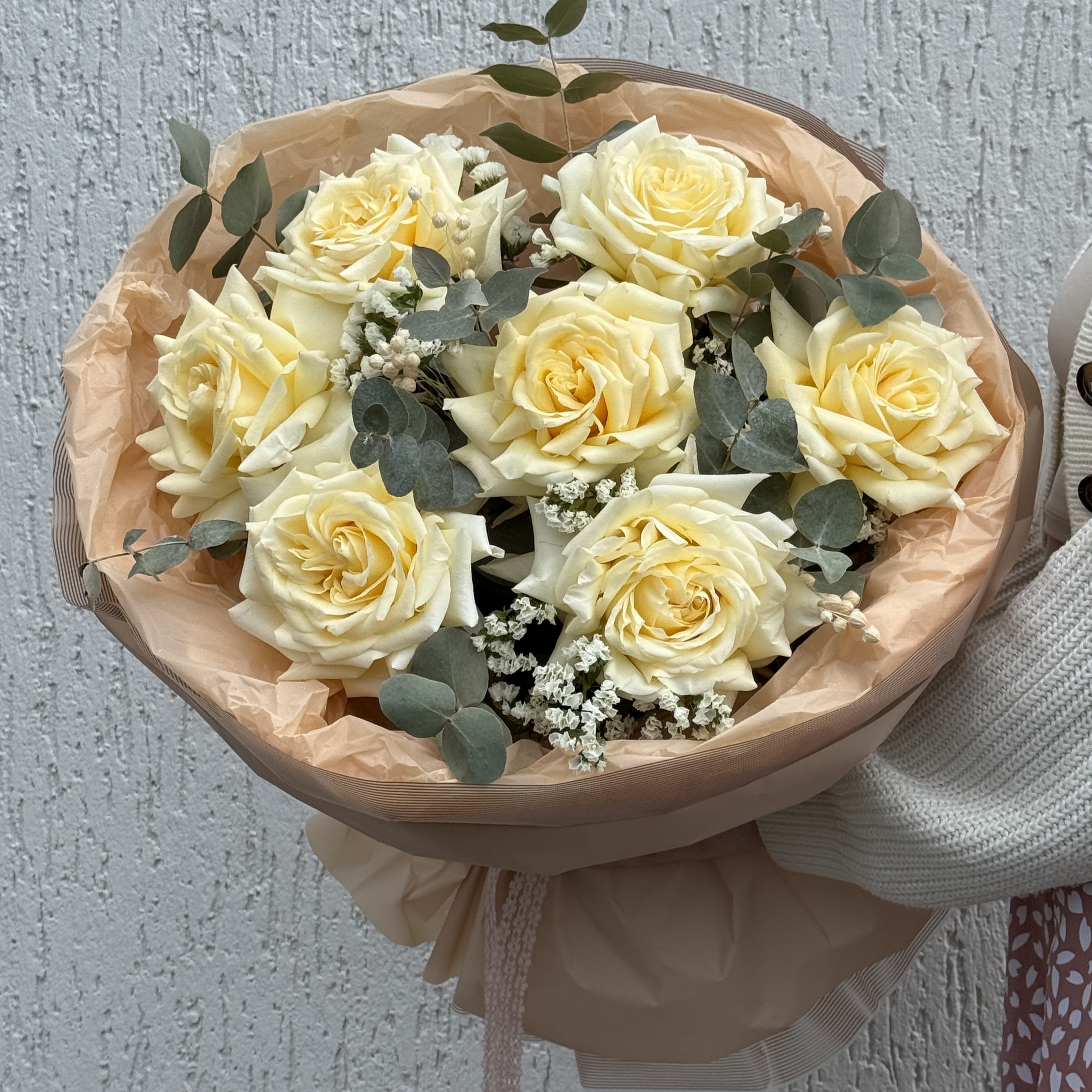 Роза 80см-7, Лимониум-3, Эвкалипт банч-0,3, Коробка-Переноска-1, Лента-1, Пленка-1