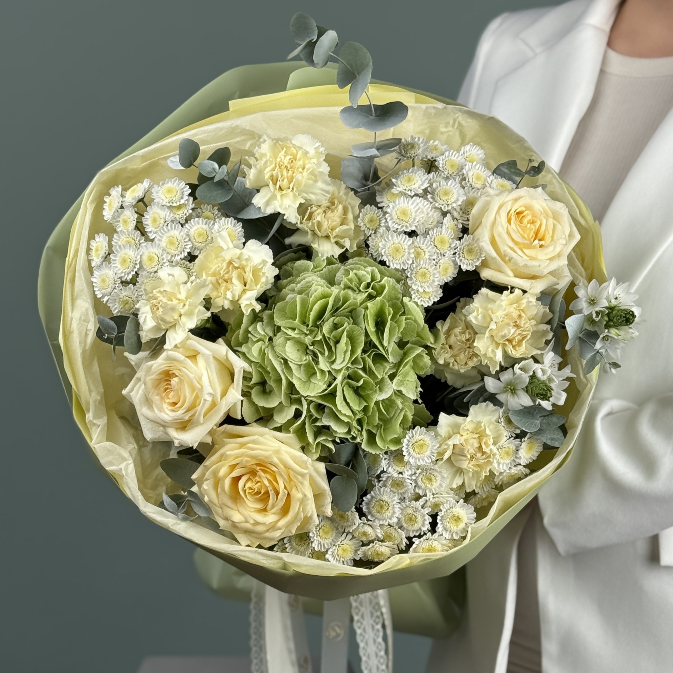 Гвоздика Голландия-7, Гортензия-1, Орнитогалум-2, Роза 60см-3, Хризантема кустовая-3, Эвкалипт банч-0,4, Коробка-Переноска-1, Лента-1, Пленка-1