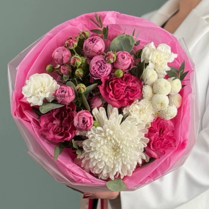 Гвоздика Голландия-3, Роза 60см-3, Роза кустовая-3, Хризантема Антонов/Магнум-1, Хризантема Мадиба-1, Эвкалипт банч-0,3, Коробка-Переноска-1, Лента-2, Пленка-2