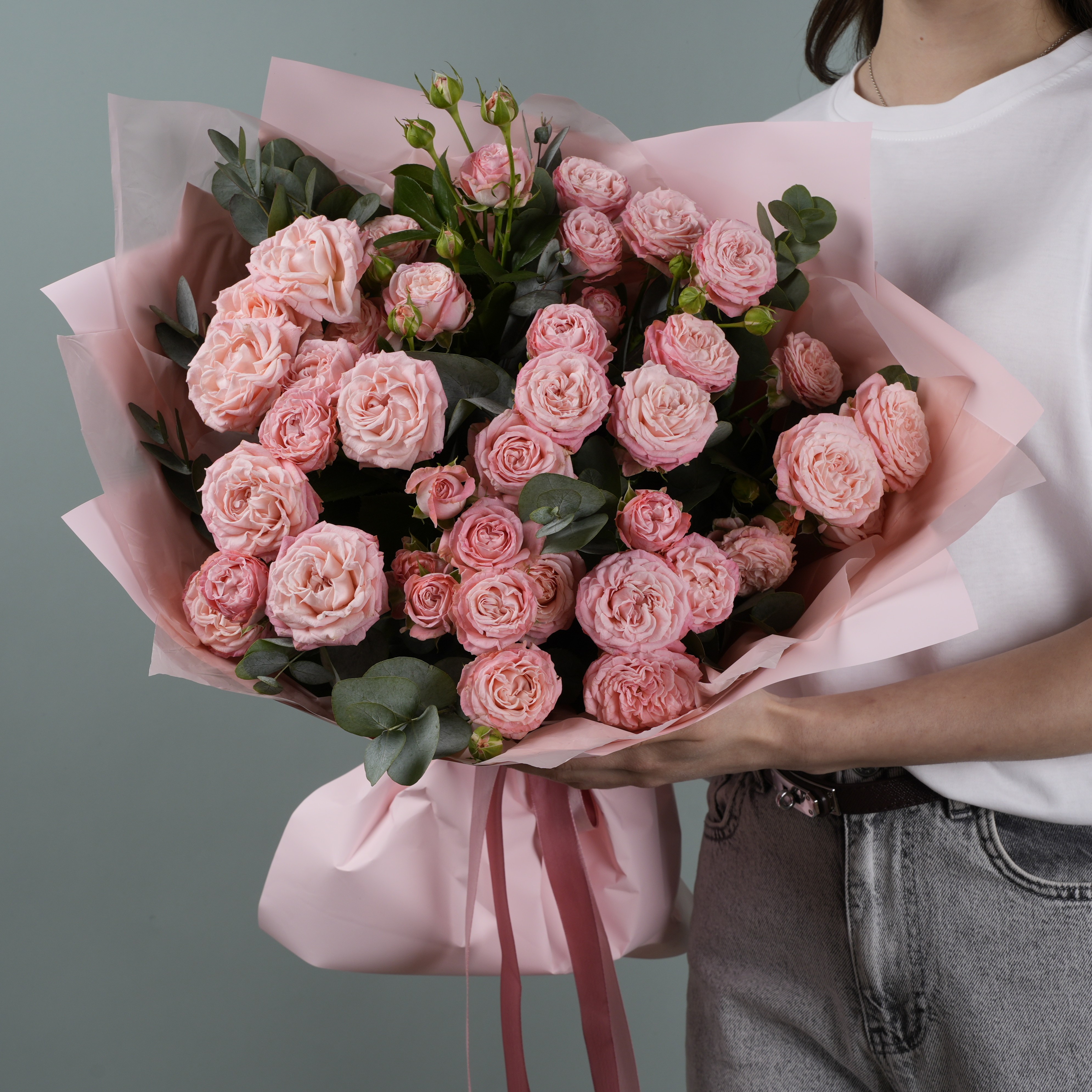 Роскошные кустовые розы в сочетании с ароматным эвкалиптом. Будет бережно доставлен в аквапаке и транспортировочной коробке.