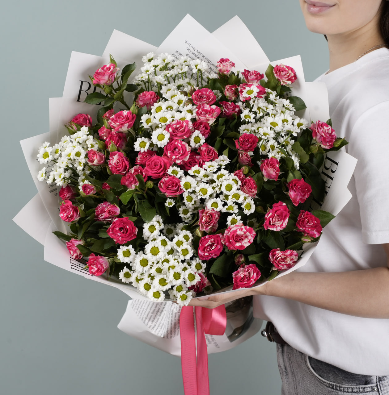 Роза кустовая-7, Хризантема Мадиба-6, Коробка-Переноска-1, Лента-1, Пленка-1