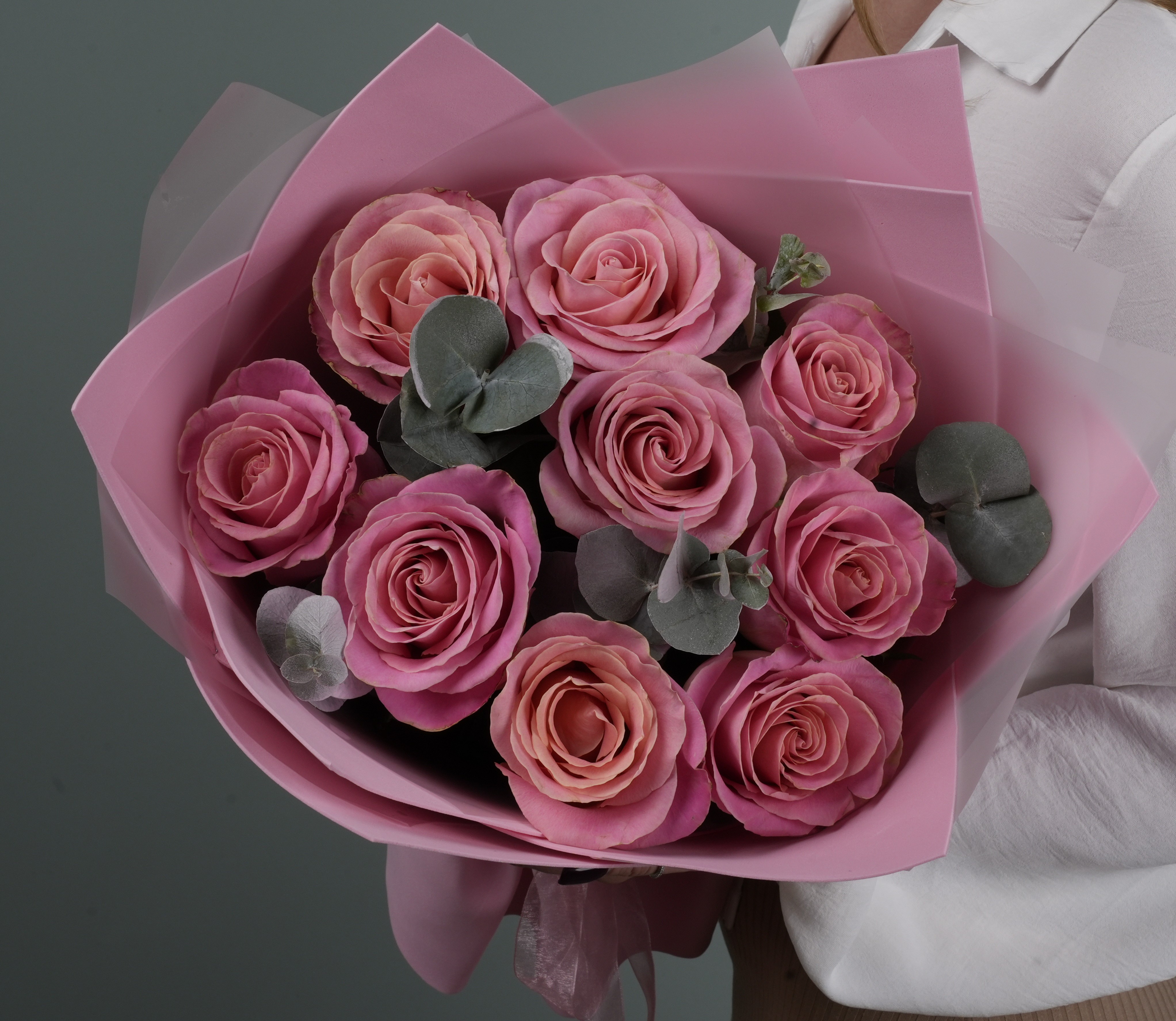 Роза 70см-9, Эвкалипт банч-0,2, Коробка-Переноска-1, Лента-1, Пленка-1