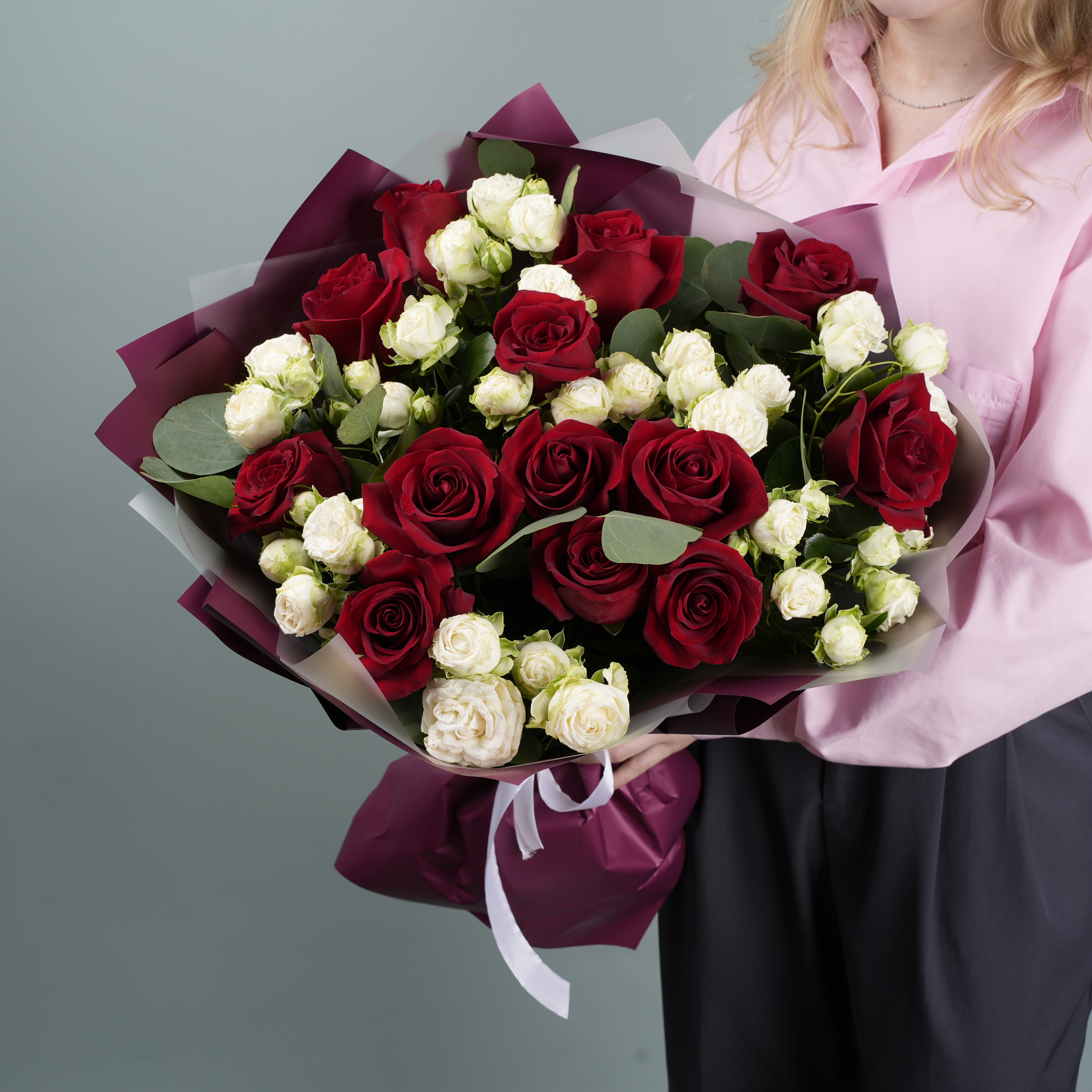 Гармоничный букет в классическом сочетании белых и красных роз.Будет бережно доставлен в аквапаке и транспортировочной коробке.