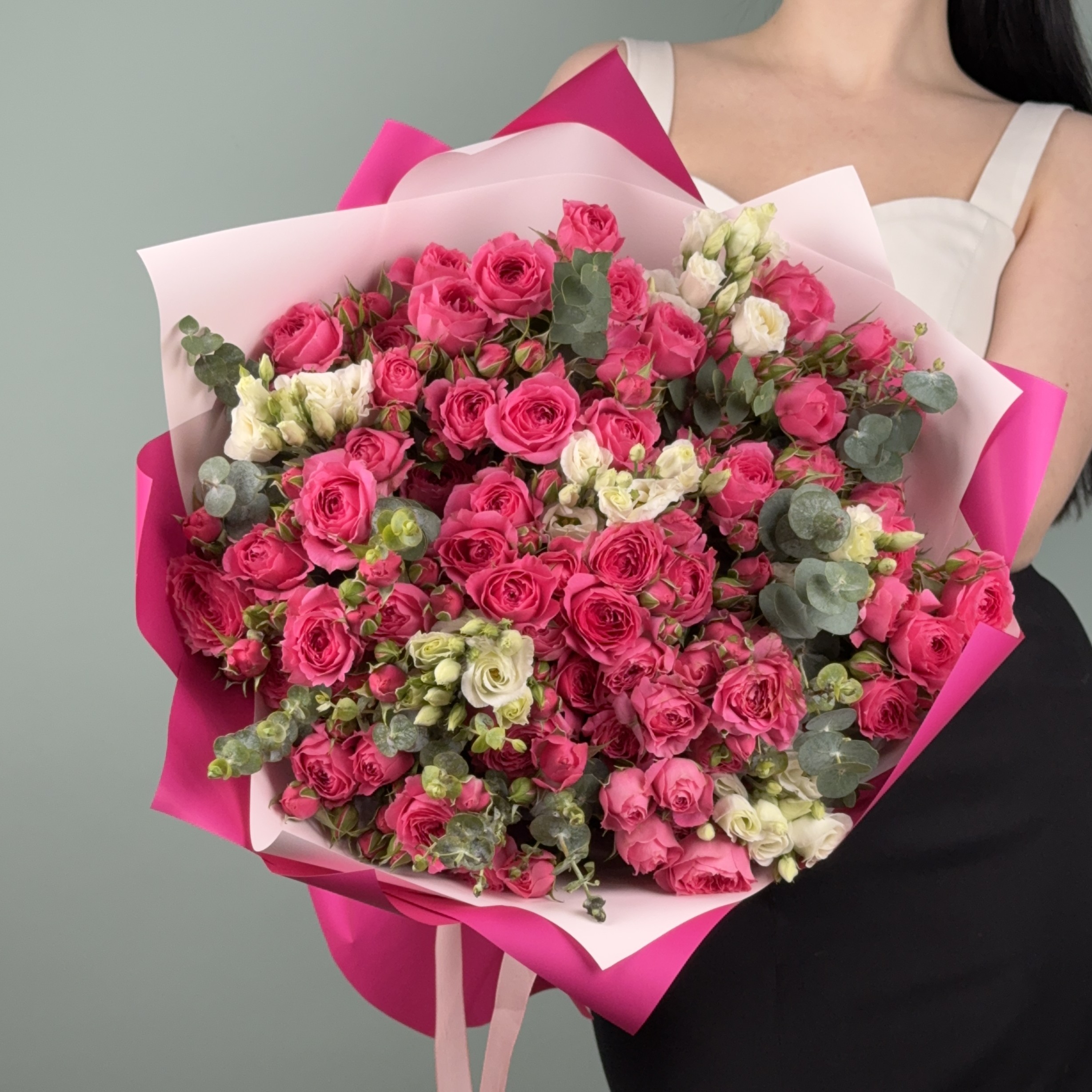 Восхитительный букет из сочных кустовых пионовидных роз и нежных эустом. Будет бережно доставлен в аквапаке и транспортировочной коробке.