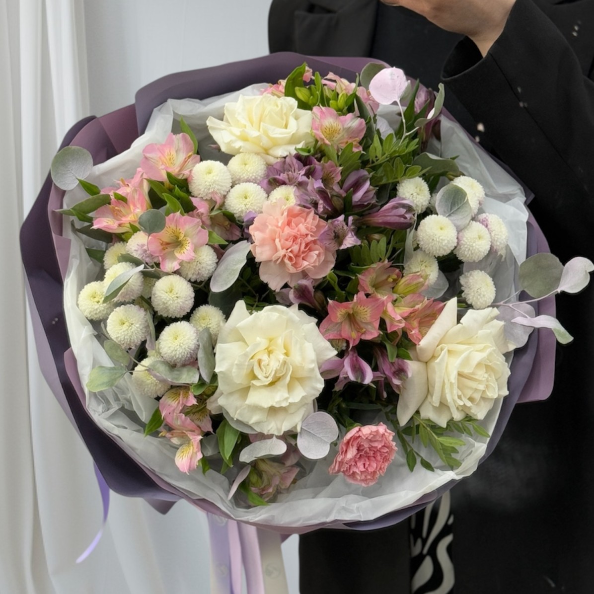 Альстромерия-6, Гвоздика Голландия-3, Роза 70см-3, Хризантема кустовая-3, Фисташка банч-0,4, Эвкалипт банч-0,35, Коробка-Переноска-1, Лента-1, Пленка-1