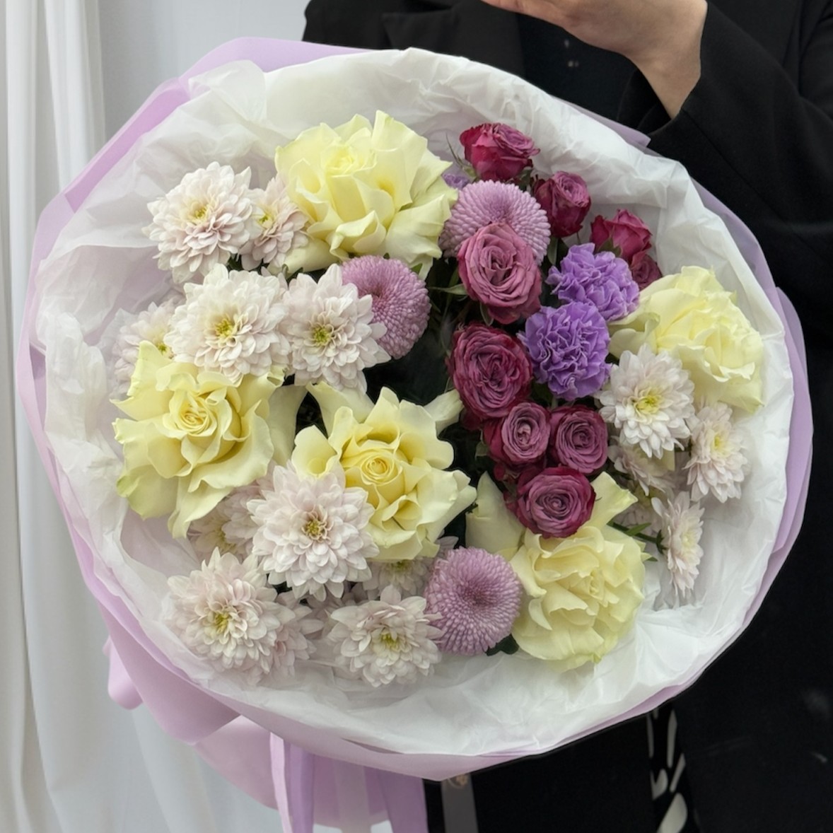 Гвоздика Голландия-3, Роза 70см-5, Роза кустовая-3, Хризантема кустовая-3, Хризантема одноголовая-3, Фисташка банч-0,3, Коробка-Переноска-1, Лента-1, Пленка-1