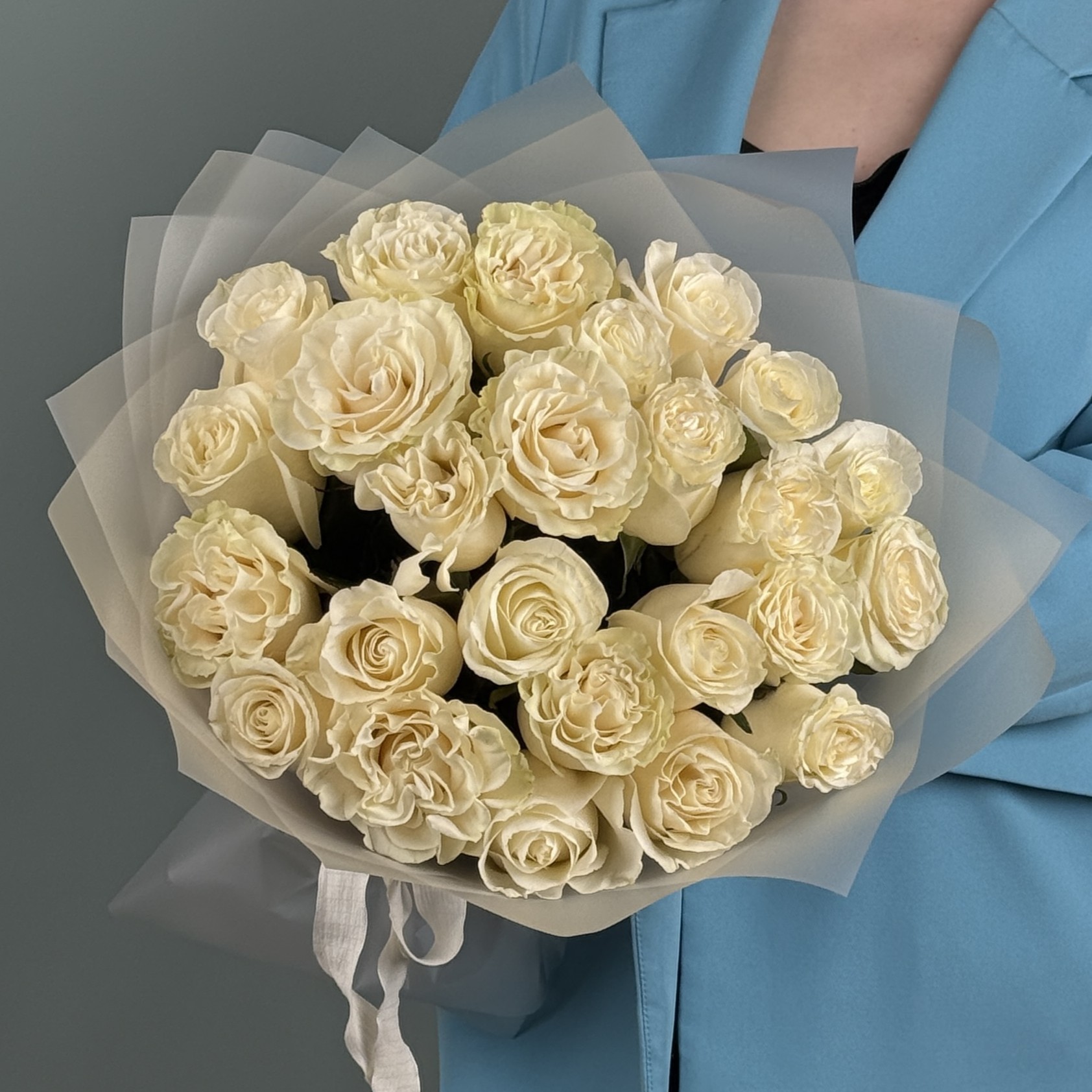 Прекрасный букет белых роз сорта Mondial. Будет бережно доставлен в аквапаке и транспортировочной коробке.