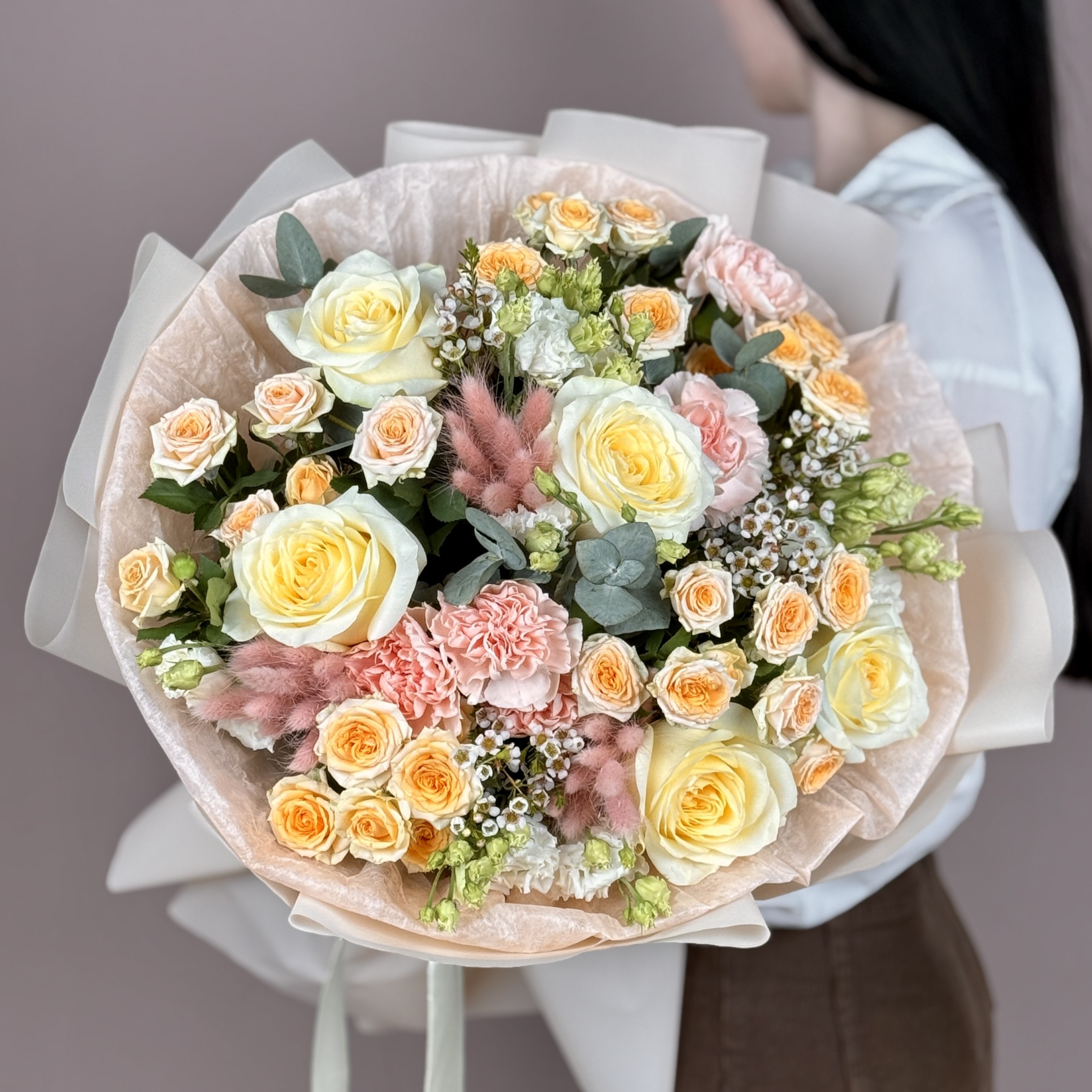 Гвоздика Голландия-5, Роза 70см-5, Роза кустовая-5, Хамелациум-2, Эустома-5, Лагурус-0,2, Эвкалипт банч-0,3, Коробка-Переноска-1, Лента-1, Пленка-1