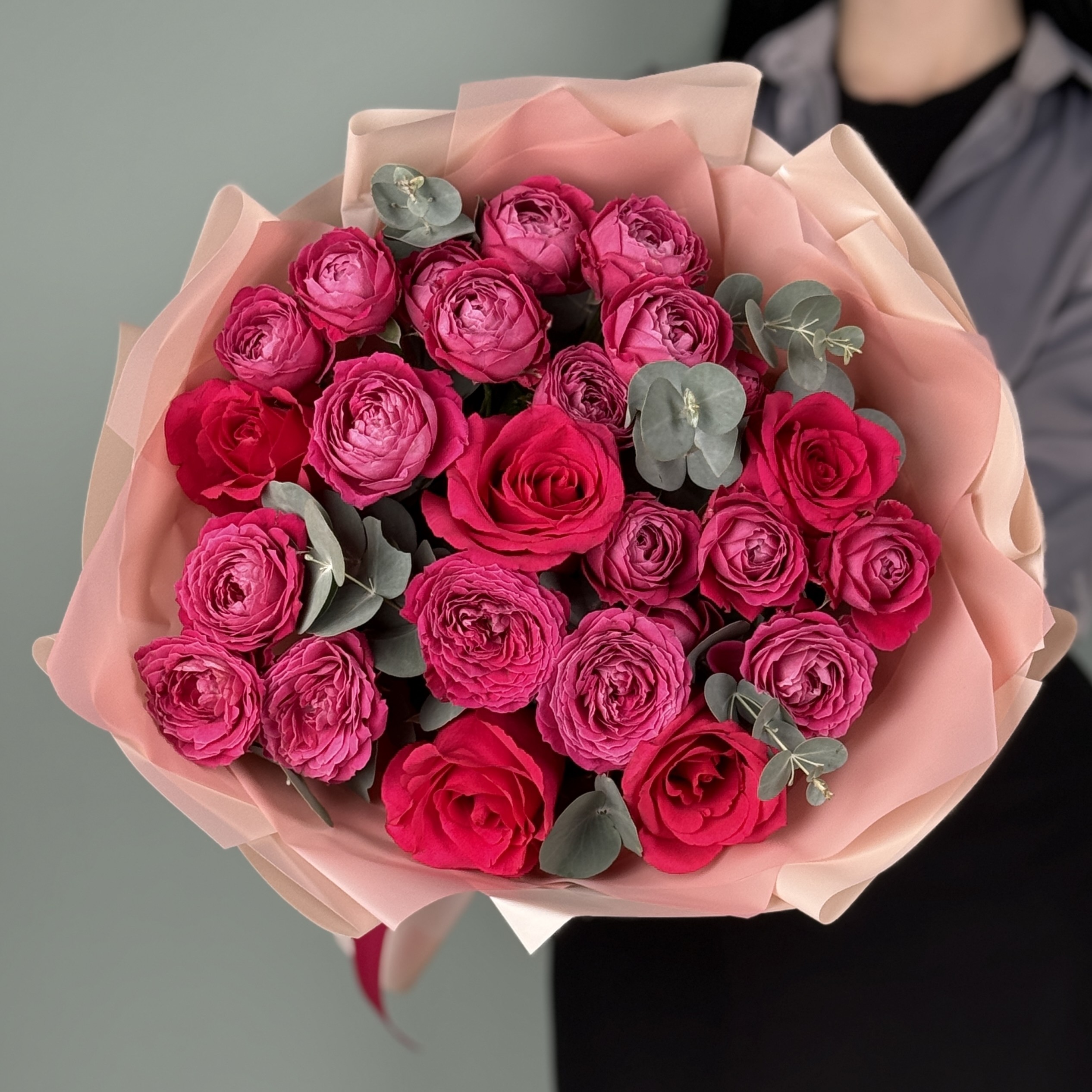 Удивительный букет в розовых оттенках с одноголовой и пионовидной кустовой розой. Будет бережно доставлен в аквапаке и транспортировочной коробке.