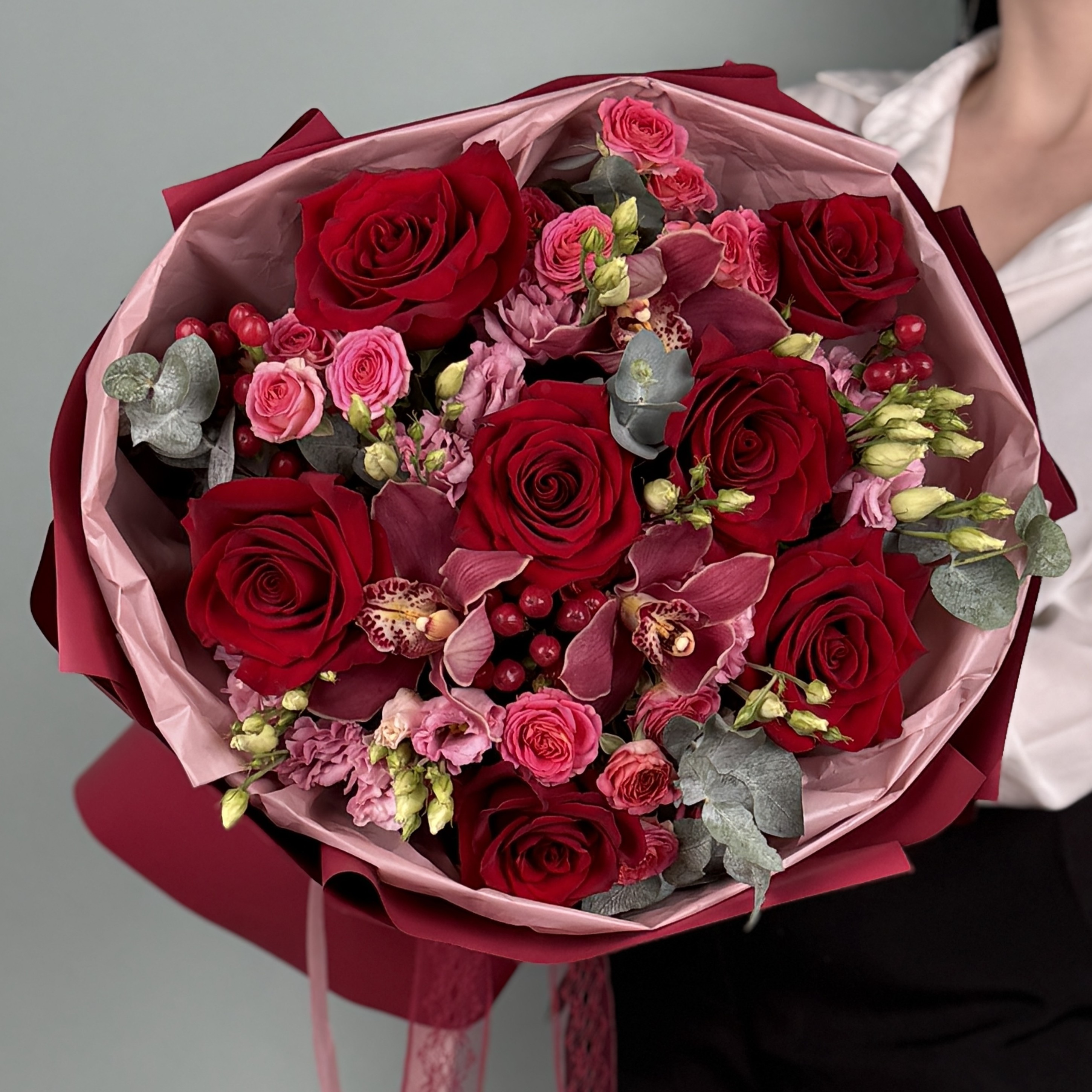 Орхидея-0,3, Роза 60см-7, Роза кустовая-3, Эустома-4, Гиперикум-3, Эвкалипт банч-0,2, Коробка-Переноска-1, Лента-1, Пленка-1